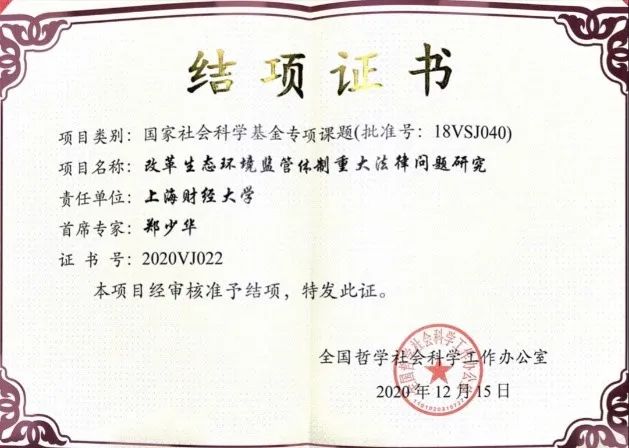 近日,我校科研处收到了全国哲学社会科学工作办公室的国家社会科学基金重大项目结项证书。由我院郑少华教授主持的研究阐释党的十九大精神国家社会科学基金专项课题——改革生态环境监管体制重大法律问题研究(批准号:18VSJ040)经审核准予结项(证书号:2020VJ022)。
