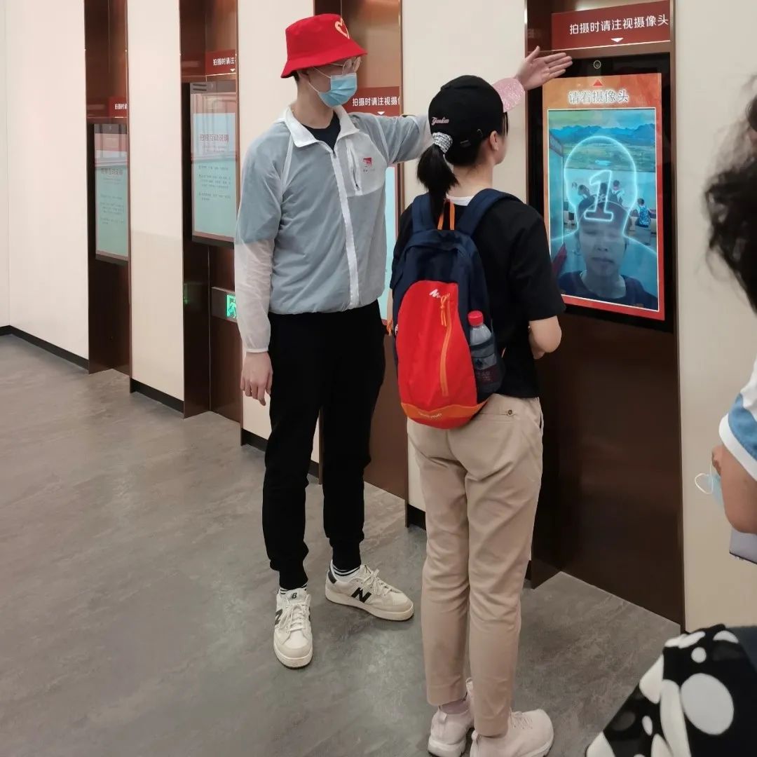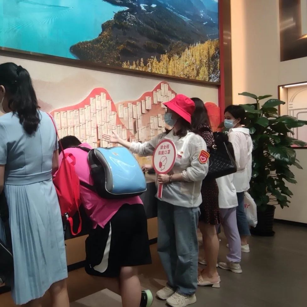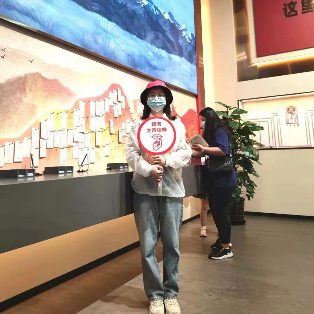 我院志愿者们主要负责《伟大的开端》地下一楼展厅的服务工作,在序厅引导游客有序进入展厅内部参观,在尾厅维护留言墙的庄严肃穆、提醒游客佩戴好口罩、为他们讲解互动项目的使用方法、引导他们安全乘坐电梯离开展厅。在服务期间,同学们从未喊苦喊累,即使身在不同岗位,大家也配合默契,团结一心,为维持场馆的良好参观环境贡献自己的一份力量,在党的诞生之地留下了自己努力的身影。
