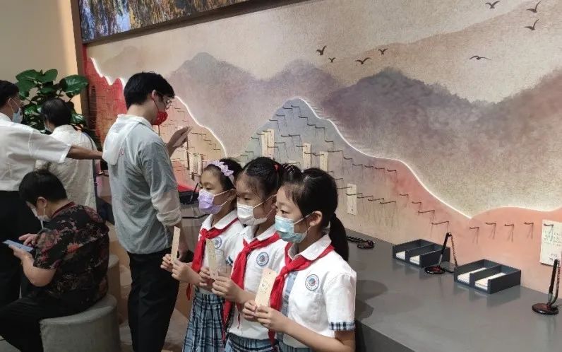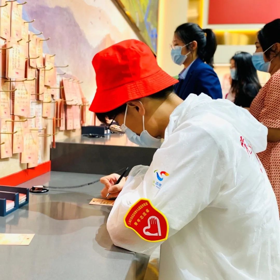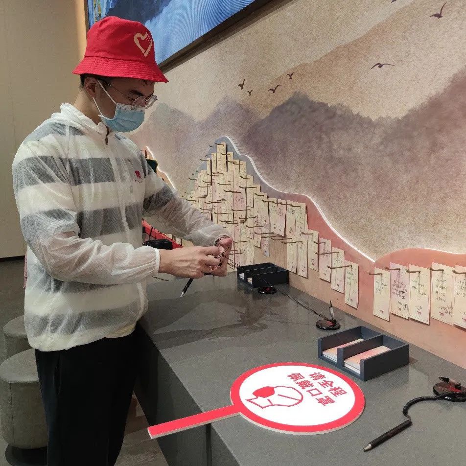 在志愿服务活动换班的间隔,同学们也热情满满,跟随馆内的解说参观了纪念馆。纪念馆以“初心使命”为主题贯穿全篇,共分为序厅“前仆后继、救亡图存”“民众觉醒、主义抉择”“早期组织、星火初燃”“开天辟地、日出东方”“砥砺前行、光辉历程”和尾厅7个板块,生动地展现了中国共产从诞生到带领中国走向繁荣富强的光辉历程。“江山,就是人民;人民,就是江山”,尾厅的大屏幕下面写满了游客对党和国家的祝福。在走完整个展厅之后,同学们也深受感染,纷纷在寄语卡上写下了自己心中想对党说的话。