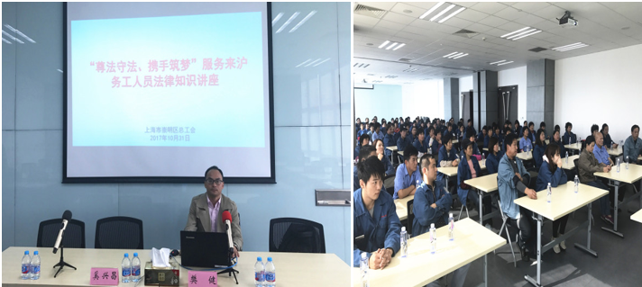 10月31日,樊健老师不辞辛劳远赴崇明,为150多名来沪务工人员开展法治宣传活动。樊健老师对劳动合同法的具体问题进行细致宣讲,前来听讲的农民工朋友全程聚精会神,不时提问,现场气氛活跃。活动结束后,听众意犹未尽,向樊健老师提出,希望能够择时再增加场次。