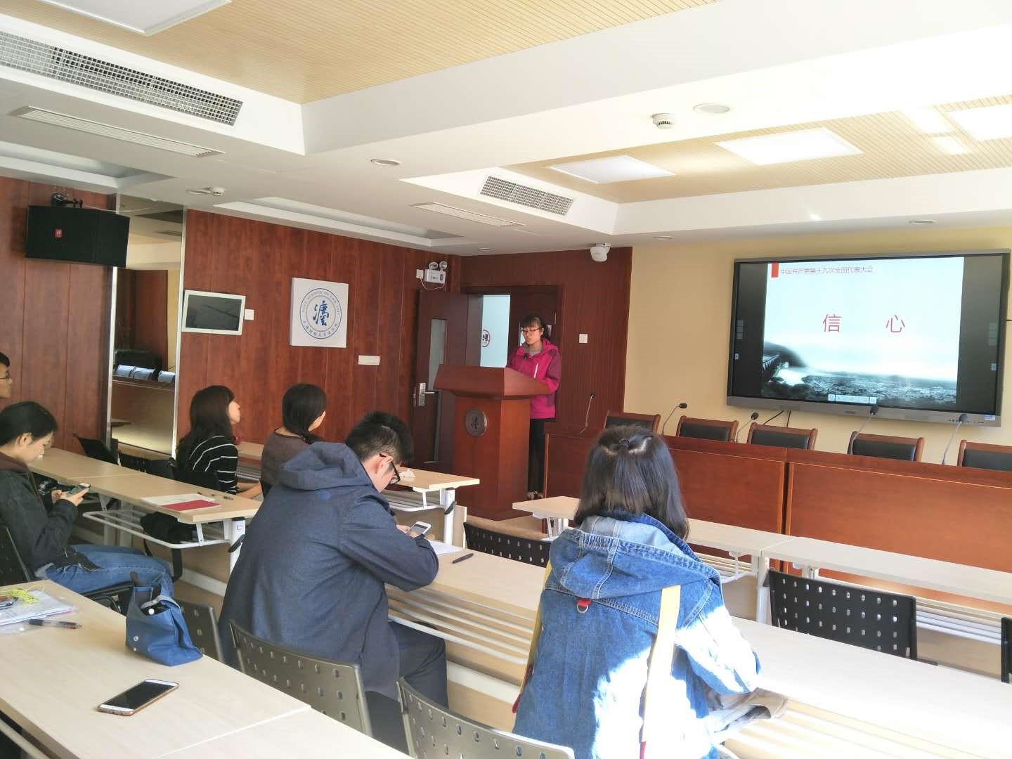 会议第三部分为“我观十九大”,该部分由法学院本科生党员陈欣同学畅谈对于本次召开的十九大的学习体会。陈欣同学谈到在十九大报告中她最深刻的体会就是感受到了执政党对于中国道路的信心。她从家乡这几十年的变化来说明中国近几十年来的巨大的发展和改变,并以2016年归国潮的兴起来展现中国强盛国力对于留学人士的强大的吸附力,最后还提到“一带一路”项目的建设展示了中国国际地位的提高。最后她引用了习总书记的讲话:“青年兴则国家兴,青年强则国家强。青年一代有理想、有本领、有担当,国家就有前途,民族就有希望。”表明了自己作为新时代青年必将为中国的繁荣富强贡献自己的力量的决心。