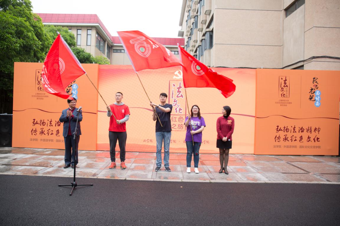 王建平主任和陈向阳书记共同为法学院、外国语学院、国际文化交流学院授予“人文行走”队旗,希望志愿者们站在新的起点,共同参与到上海市人文行走项目当中。