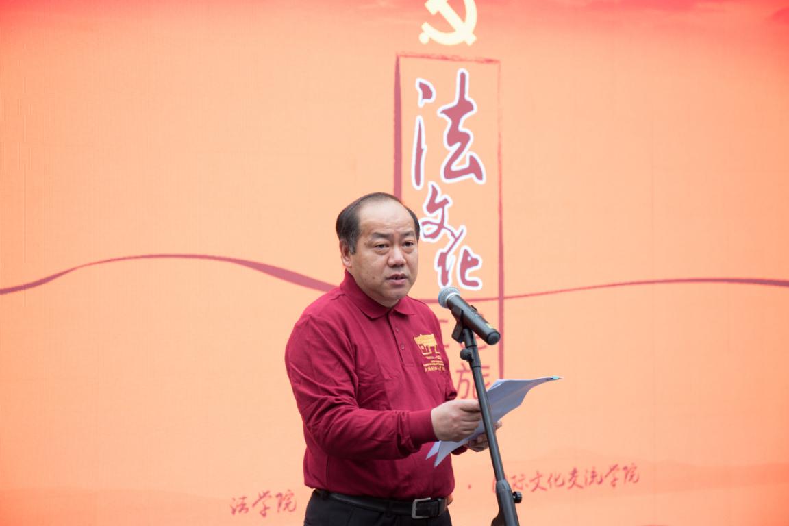 校党委副书记朱鸣雄发表讲话。2019年正值五四运动100周年,也是上海财经大学法学会成立30周年,在这特殊的年份里,法学院、外国语学院和国际文化交流学院的同学们与班主任老师一起走进中共一大会址、中华艺术宫《东京审判》巨幅画展、上海犹太难民纪念馆等15个红色景点,通过探寻中国革命与改革开放时期的发展历程,结合法学文化特色,在历史长河里找寻法律和法律人的故事,一次行走一堂微课,在历史中反思未来,在实践中探索理论,在行走中明确时代赋予的责任!同学们不仅加深了对上海红色文化的理解,也弘扬了法治精神。今天,我们在校园里组织红色法文化游园活动,既是对上海红色文化的一次具有特色的总结与展示,同时也在新时代里重新阐述了五四精神的内涵与意义。